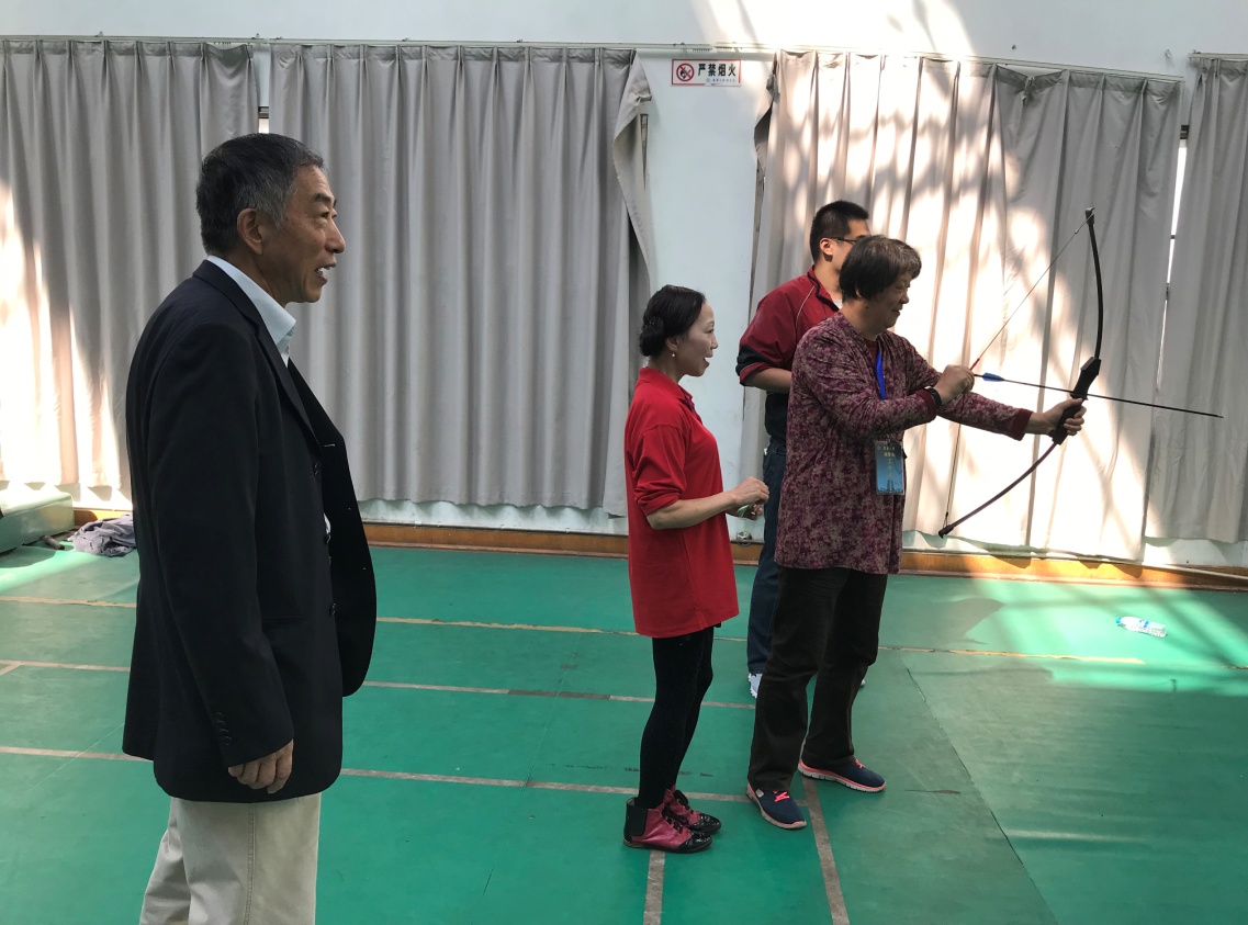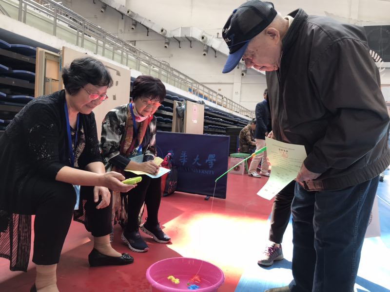 射击游戏边上排了一队的男老师,大家好像都焕发出青春,瞄准、射击、击中一套动作行云流水、一气呵成。那边不时地爆发出一阵阵喝彩,弯弓搭箭,射向标的,许多老师好像回到了小时候。“钓鱼”游戏边,张老师正屏息静气地用“鱼钩”在脸盆边钓“鱼”,当一条“鱼”儿出水,便引得围看老师们一阵欢呼。飞镖、迷你保龄球、推杆入洞等项目的场地前都挤满了跃跃欲试的老同志们,欢声笑语不时从场馆内响起……。整个运动会持续了近3个小时,1500多位老同志根据自己的喜好积极参与。