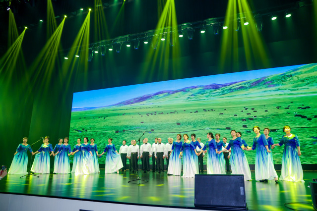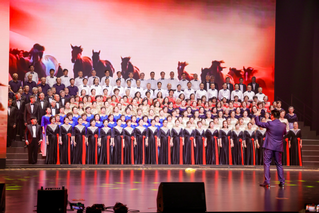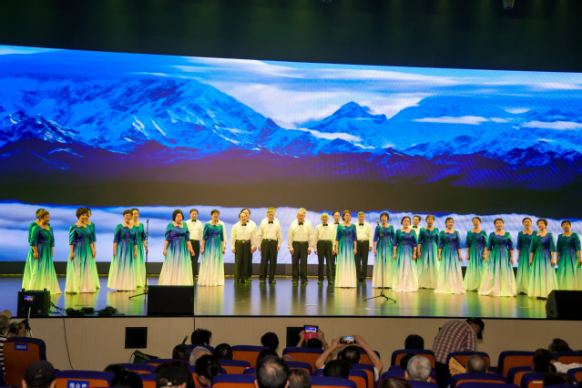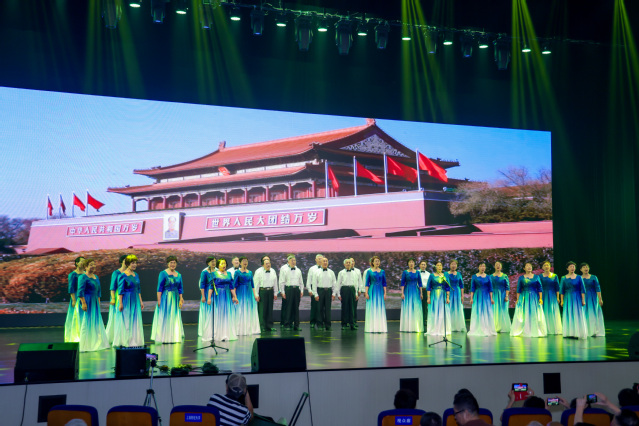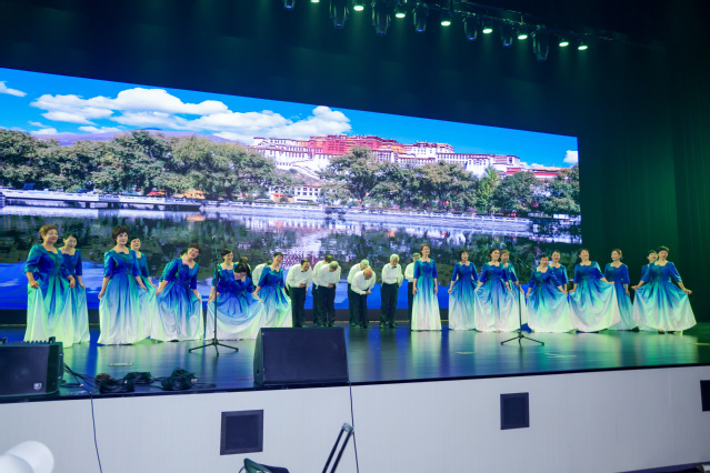 我校退休教师合唱团单独表演了小合唱《金瓶似的小山》,参演了《大刀进行曲》、《保卫黄河》、《在灿烂阳光下》等大型合唱曲目,他们用歌声传递红色记忆,彰显我校老同志践行“为党育人、为国育才”的赤诚初心。当《金瓶似的小山》优美动人的旋律响起,团员们款款登场,用温暖真挚的歌声歌唱着对党的衷心爱戴,对幸福生活的深情赞颂与美好憧憬,温暖的旋律、真挚的表演赢得了观众的阵阵掌声。