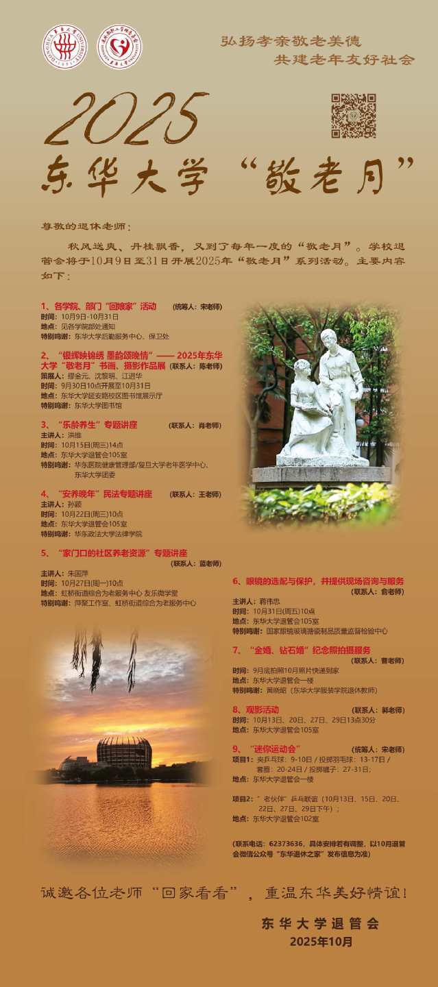 主办部门:东华大学退管办 地址:上海市长宁区中山西路865号老年活动中心 邮编:200051 电话号码:62373636(退管会)62373671(老年大学) 电子邮件:dhutgh@dhu.edu.cn