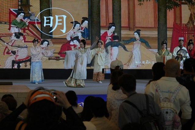 《诗经》的诗句、《簪花仕女图》的画卷、“高山流水”的琴音……在生动的专业讲解、朝代音乐和AI画卷的衬托中,服饰不再是静态的织物,而是鲜活的历史载体——它 串联起文学典故与时代风貌,诉说着中华千年服饰的审美意趣与生活智慧。