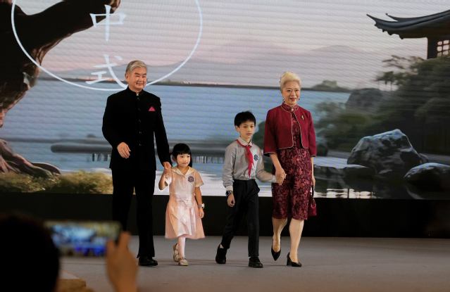 当银发老者牵着可爱孩童的手走上T台,两代人的身影在聚光灯下交叠,不仅是岁月的对话,更是中华服饰文化“传承不息”的生动写照。展演还特别呈现了我校退休教师张祖芳教授领衔的匠心之作——“纸艺华服”。作为展示中国传统技艺与现代设计创新的跨界项目,在2025“上海设计100+”全球竞赛的激烈角逐中,“纸问东西-第47届世界技能大赛闭幕式表演服装设计”在“设计洞见未来”板块中脱颖而出,获得全球竞赛Top100项目。此次展演的两件“蝶变”华服,融合了非遗剪纸、环保处理与光电集成等工艺,让观众在光影开合间感受到了传统技艺的创新和文化自信的魅力。