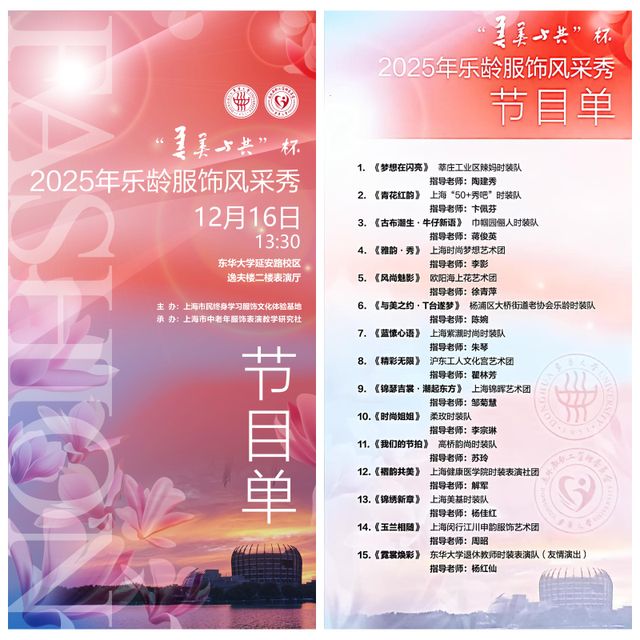 近日,由上海市民终身学习服饰文化体验基地主办、上海市中老年服饰表演教学研究社承办的“美美与共”杯2025年乐龄服饰风采秀在东华大学延安路校区逸夫楼表演厅举行。不同于常规赛事的激烈角逐,本次乐龄服饰风采秀以切磋交流为主,15支沪上中老年时装队以服饰为媒、以文化为魂,在T台上勾勒出冬日申城最具韵味的乐龄时尚风景线。东华大学官网、东方网、上海老年报等进行报道。
