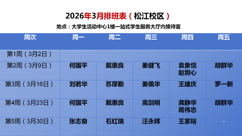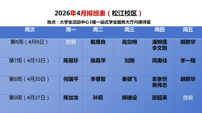 接待地点:松江校区一站式学生服务大厅内老教授咨询室、延安路校区各学院一站式学生社区