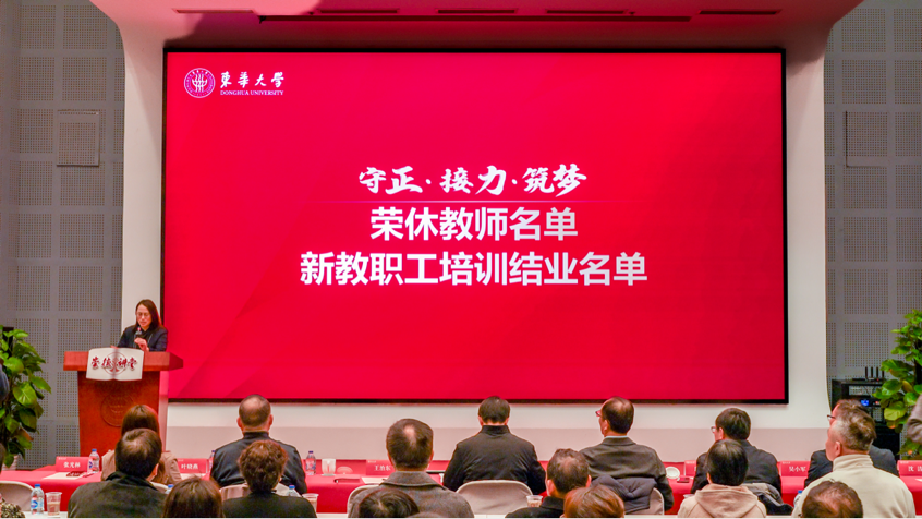 荣休教师代表、纺织学院教授郭建生在发言时回望在校四十载的教学科研生涯,分享了将经纬之道融入为产业、行业育人的点滴。基建处原处长汤跃宁动情讲述从公安干警到教育工作者的初心坚守和暖心故事,诠释平凡岗位育人育德的温度与担当。材料科学与工程学院教授张骐昊代表新教职工表达了以实干践行教育家精神、服务强国建设的坚定决心。